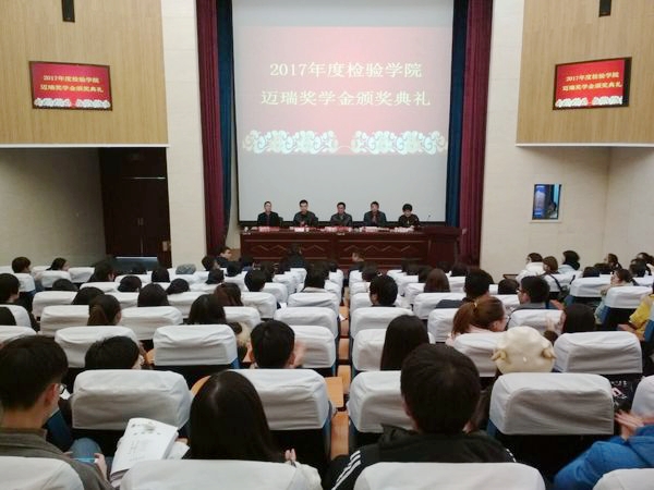 2017年12月26日,检验学院2017年度迈瑞奖学金颁奖典礼在逸夫科技楼学术报告厅举行。迈瑞检验安徽公司总经理杨志,学生处副处长张琪琪、教务处副处长陈祥攀,检验学院党总支书记、院长文育锋,党总支副书记、副院长崔晓霞出席了本次颁奖典礼。检验学院2015级、2017级医学检验技术专业的全体同学参加了典礼。典礼由崔晓霞主持。